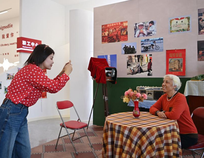 9月28日,演员在府横街小吃一条街上为商家“送福”。