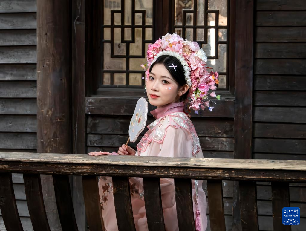 一名游客头戴“簪花”在福州市千年古街三坊七巷里打卡留影(2月3日摄)。