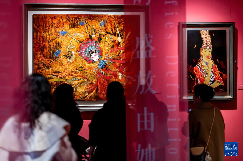 观众在福建省沈绍安漆艺博物馆里观赏女性题材的漆画作品(3月7日摄)。