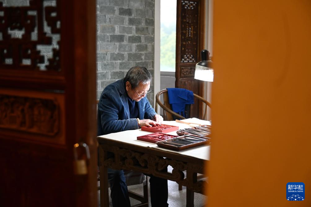 3月4日,中国工艺美术大师袁师永在进行雕漆创作。