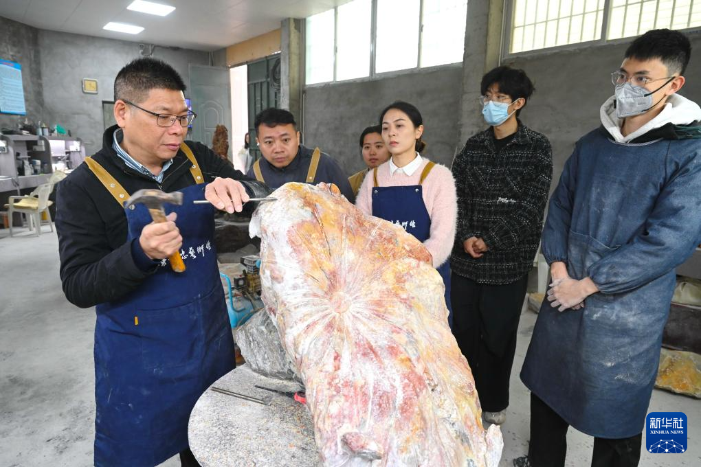 3月5日,在福建省工艺美术大楼寿山石雕刻工作室,中国工艺美术大师郑则评(中)在指导学生进行寿山石雕刻创作。