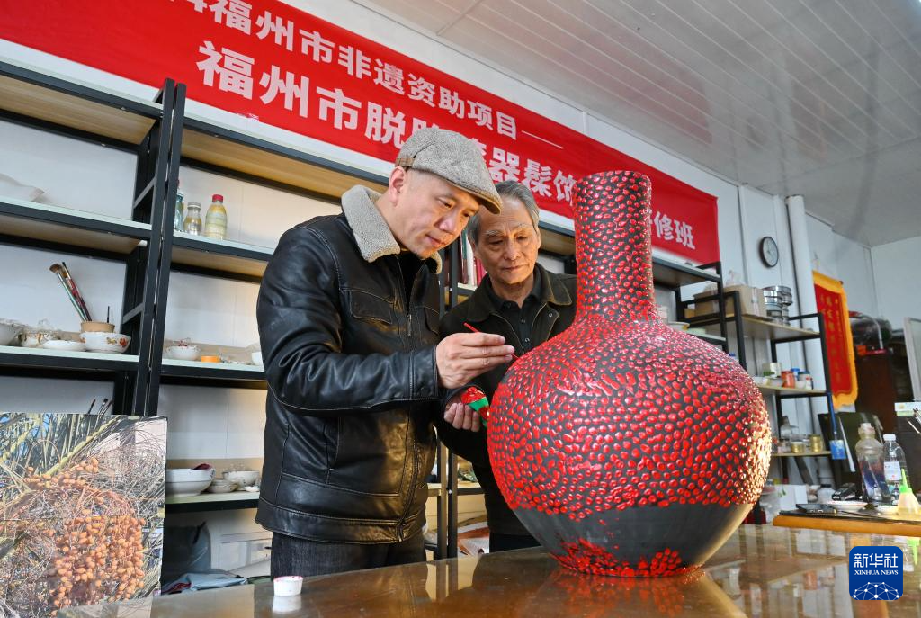 3月6日,福建省工艺美术大师陈天灨(右)在指导学生进行漆器髹饰技法。