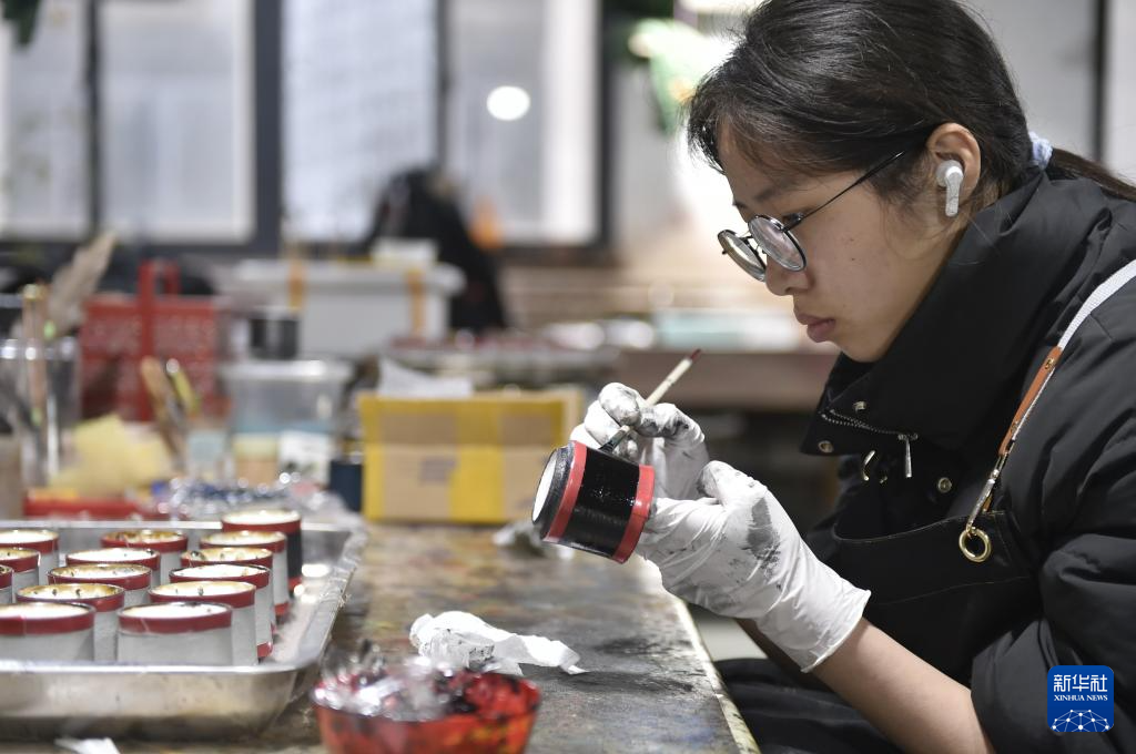 3月6日,在福州漆研堂文化传播有限公司生产车间,工作人员在制作漆艺茶具产品。
