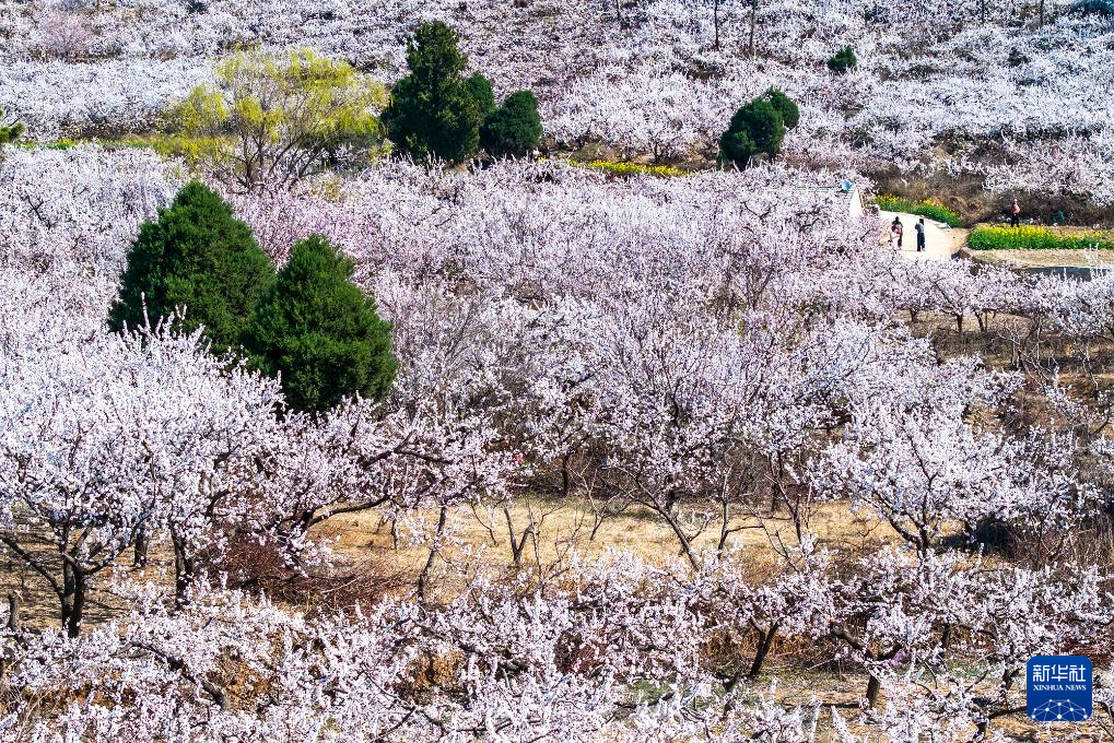 3月18日,游客在河南省永城市芒砀山旅游区赏花游玩(无人机照片)。