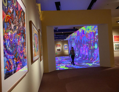 10月23日,在新建成的鲁迅故里二期,人们经过鲁迅作品主题灯箱。