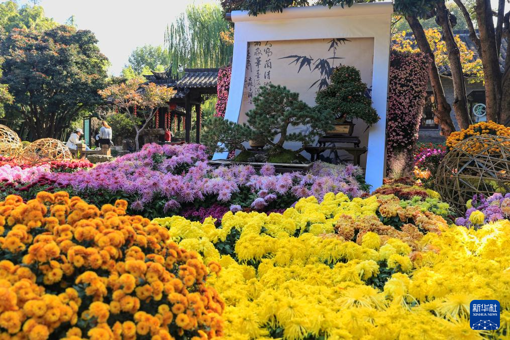 11月10日,人们在江苏扬州个园景区“菊隐个园,四时闲趣”为主题的精品菊展上赏菊游玩。