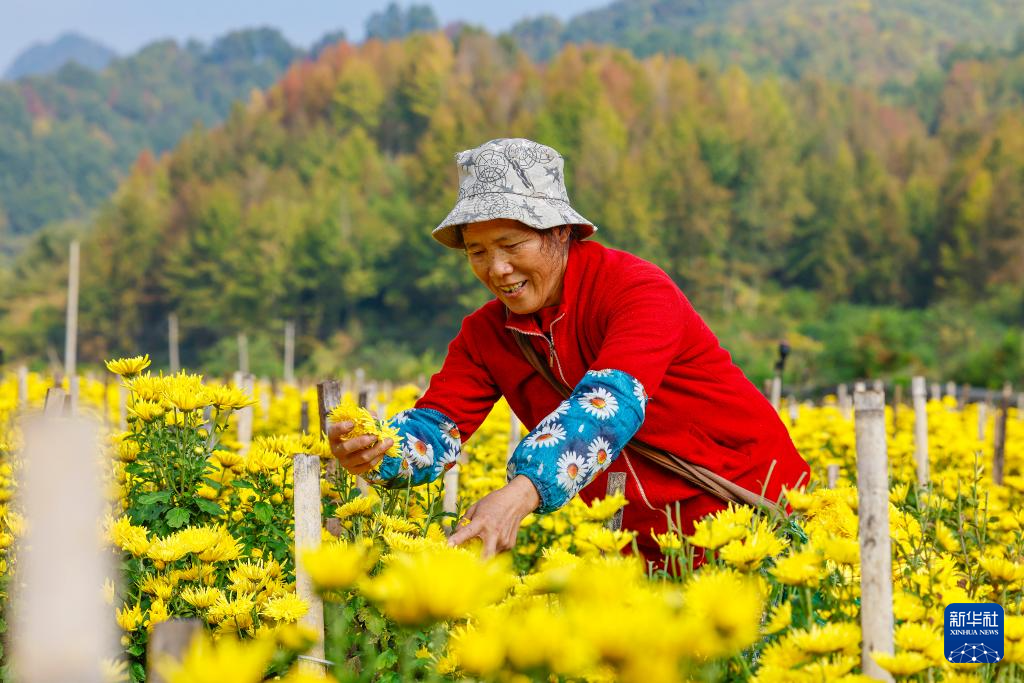 10月28日,安徽省黄山市歙县溪头镇桃源村农民采摘金丝皇菊。