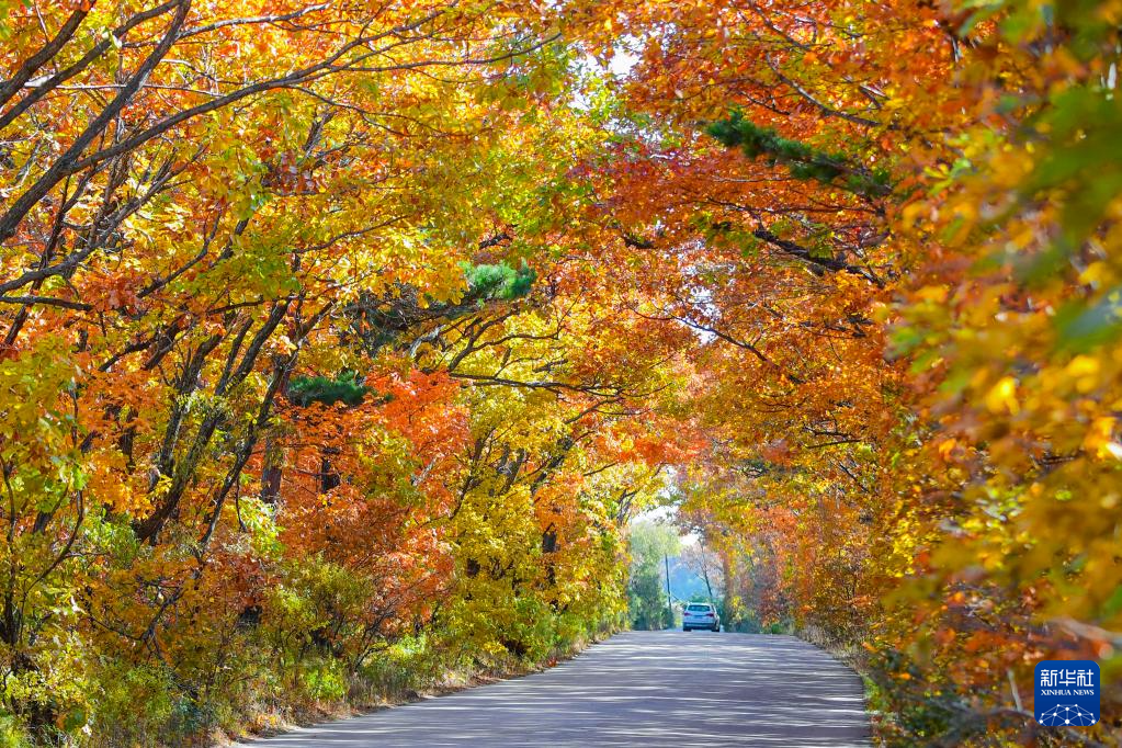 10月24日,在黑龙江省密山市的兴凯湖湖岗上,一辆汽车从色彩斑斓的林荫道中驶过。
