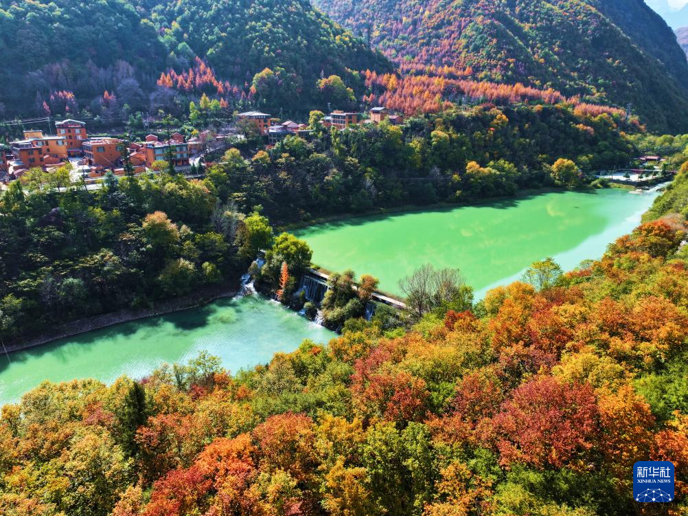 11月2日在甘肃省陇南市宕昌县官鹅沟景区拍摄的秋景(无人机照片)。
