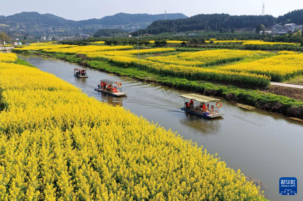 3月5日,游客在四川省南充市蓬安县正源镇石牛村乘坐游船赏花游玩(无人机照片)。