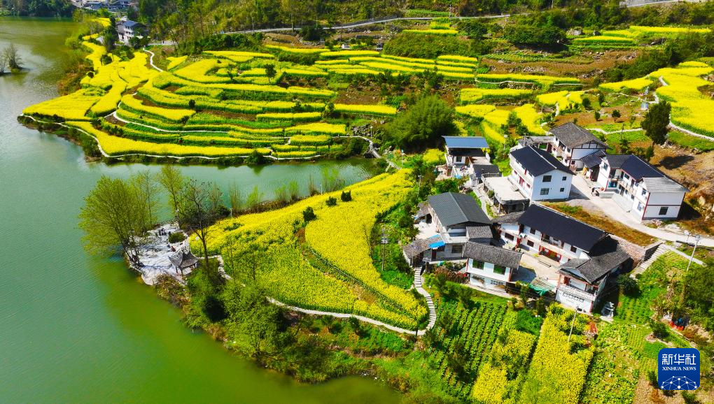 重庆市黔江区阿蓬江镇大坪村油菜花开放(3月4日摄,无人机照片)。