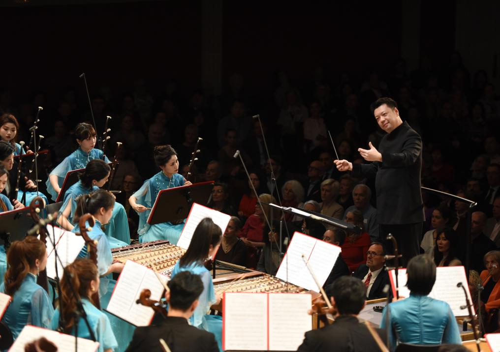 2026年2月26日晚,中国春节民族音乐会在奥地利首都维也纳举行,无锡民族乐团音乐总监兼首席指挥孙鹏(右上)在指挥演奏。新华社记者贺灿铃 摄