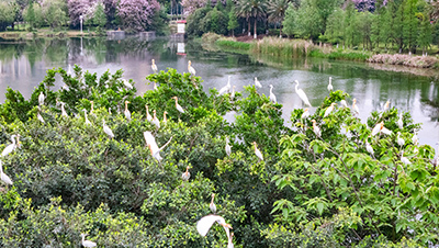 广西贺州市爱莲湖公园内,成群白鹭或栖息枝头,或展翅翱翔,勾勒出春日里灵动的生态画卷。